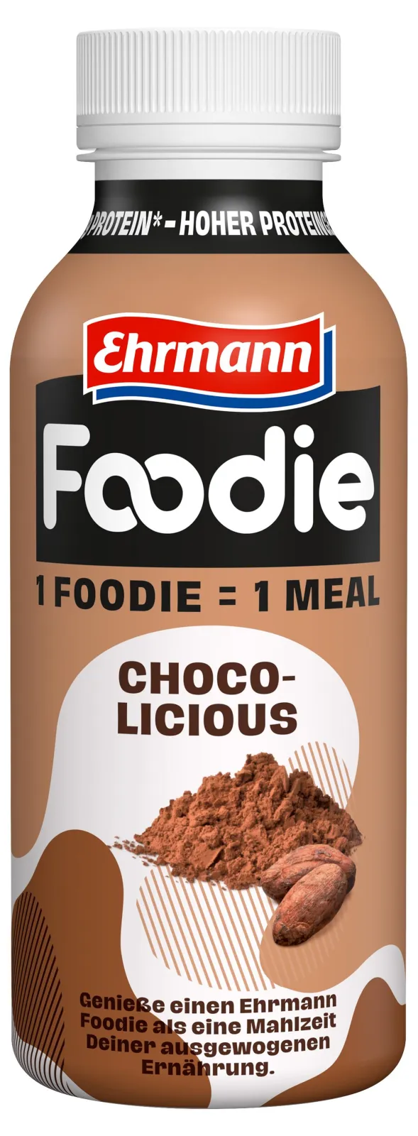 1 Foodie = 1 Meal. Ehrmann Foodie is a delicious drinking meal with important nutrients that your body needs. A 400ml bottle contains 30g of protein, is lactose-free, gluten-free and has no added sugar*.
